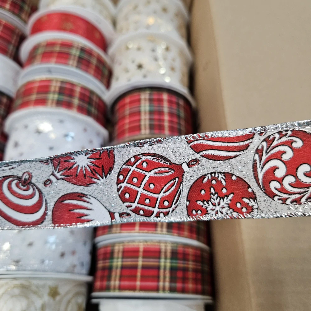4cm vianočná stuha - sivo strieborná s červenými guľami / meterSkladom1,50 EUR/ ks1,22 EUR bez DPH