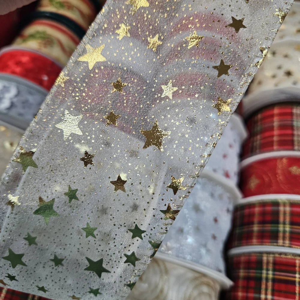 7cm vianočná stuha - biela organzová so zlatými hviezdami / meterSkladom2,00 EUR/ ks1,63 EUR bez DPH