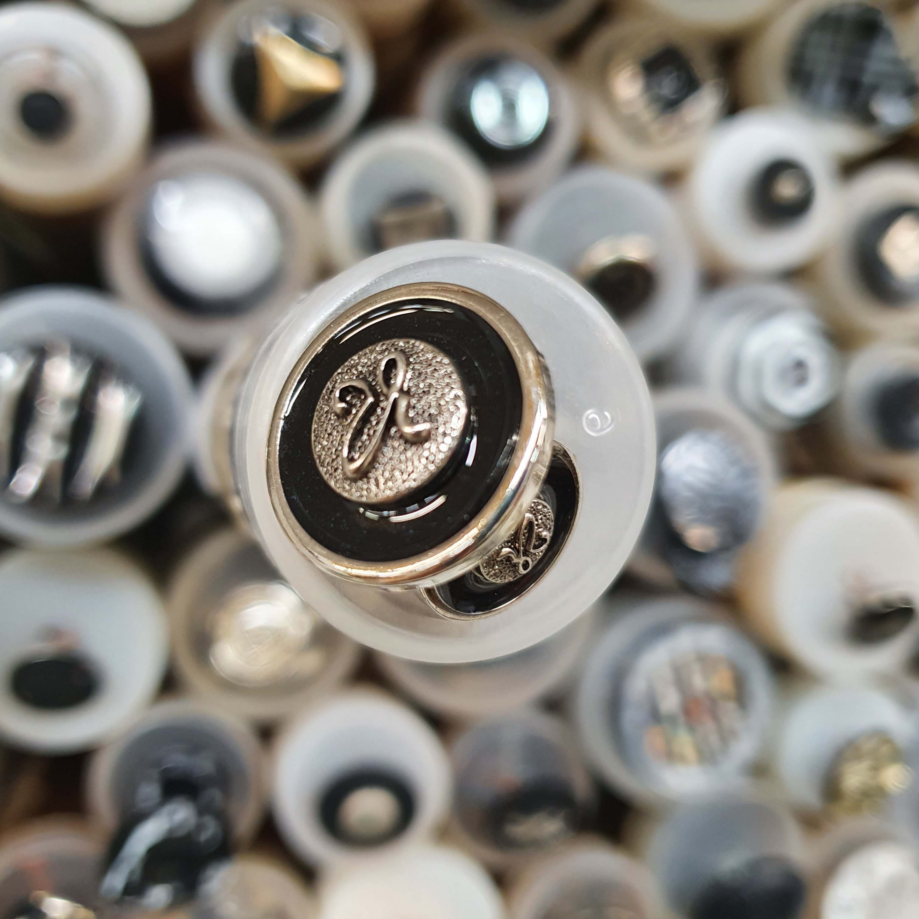 Čierno strieborný gombík menší ozdobný okrúhly živicový cca 1,5cmSkladom0,30 EUR/ ks0,24 EUR bez DPH