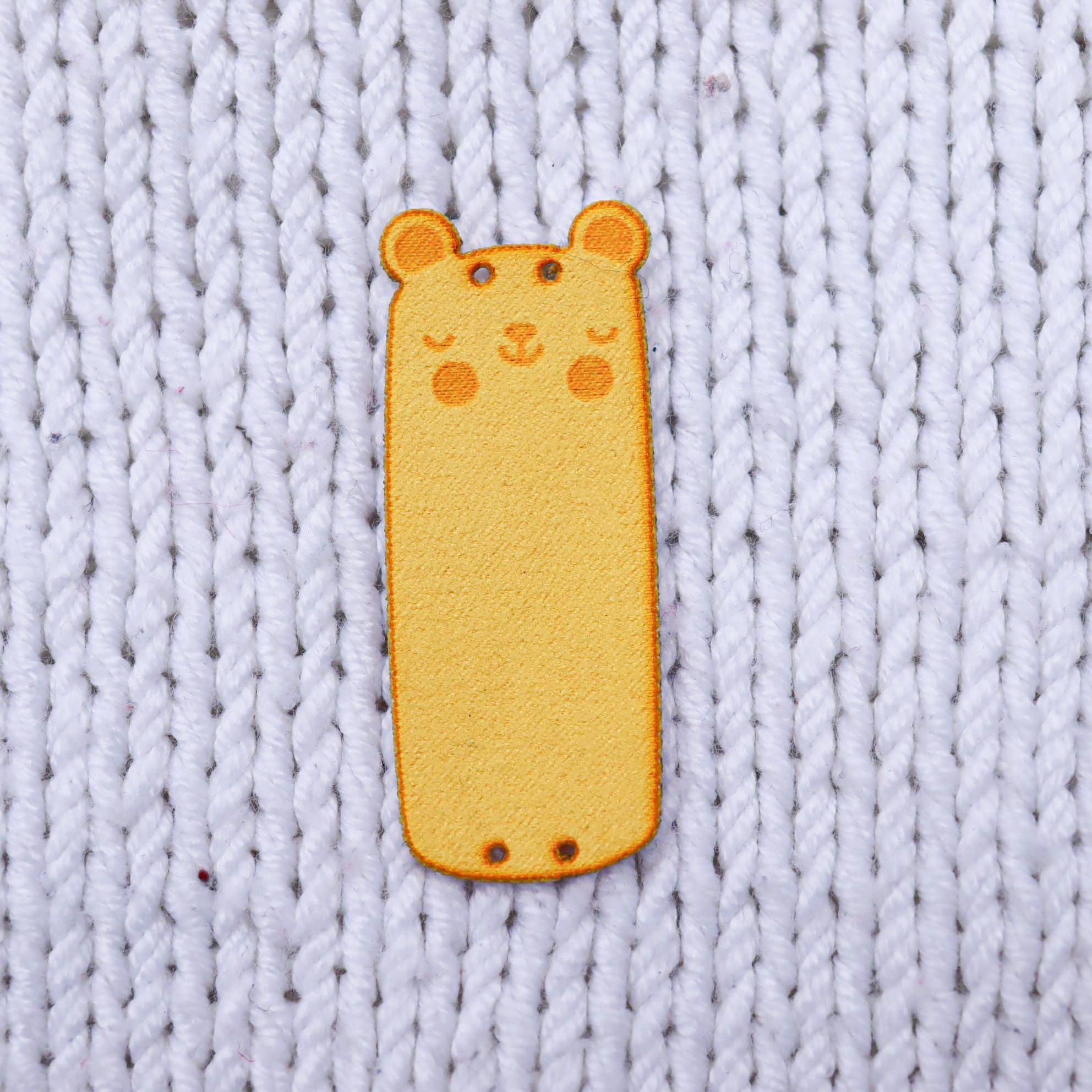 - I9 - Žltý maco štítok / nápis ekokoža cca 5,3x2,2cm