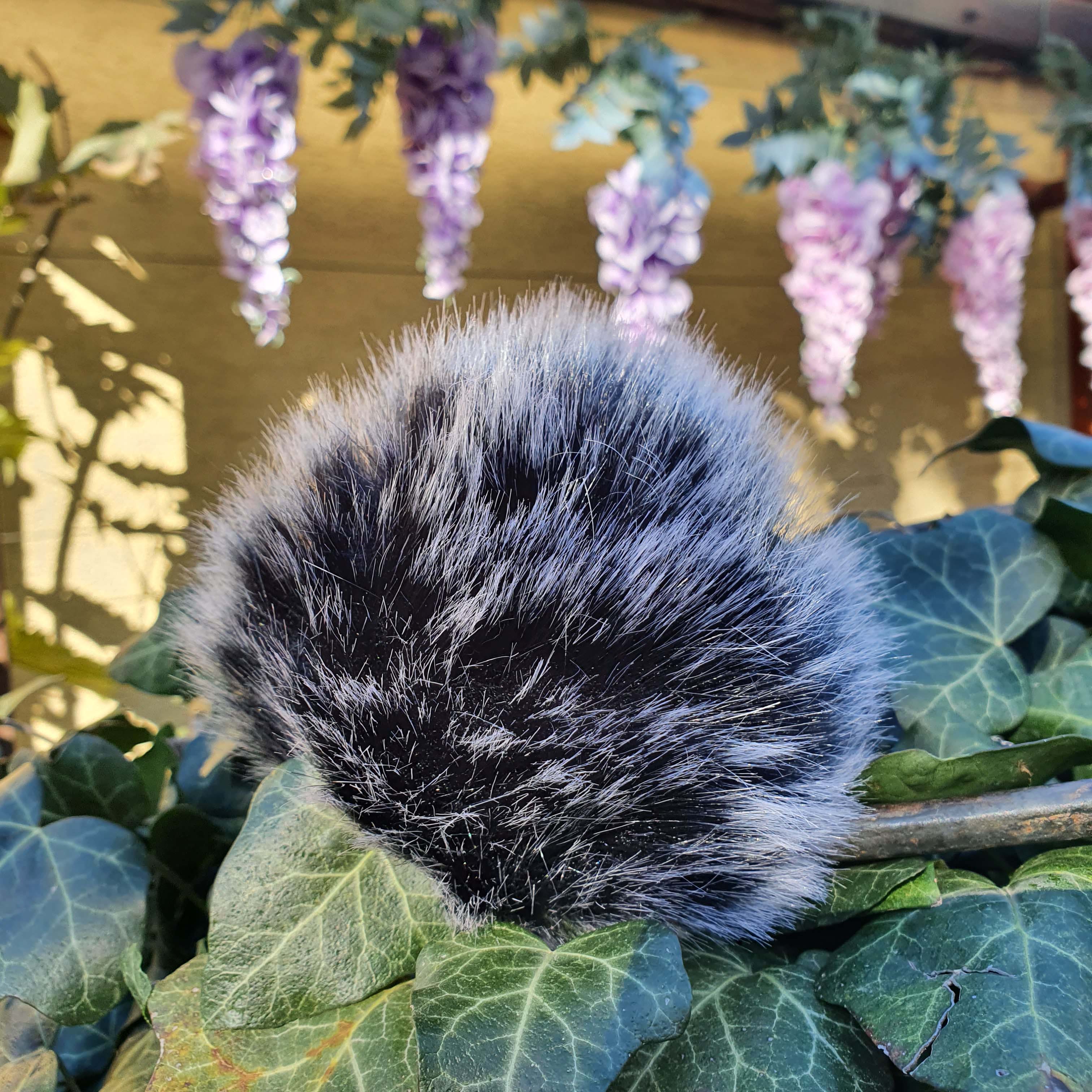 M stredný cca 12 cm čierny s bielymi koncami kožušinkový brmbolec na čiapku z umelej kožušiny