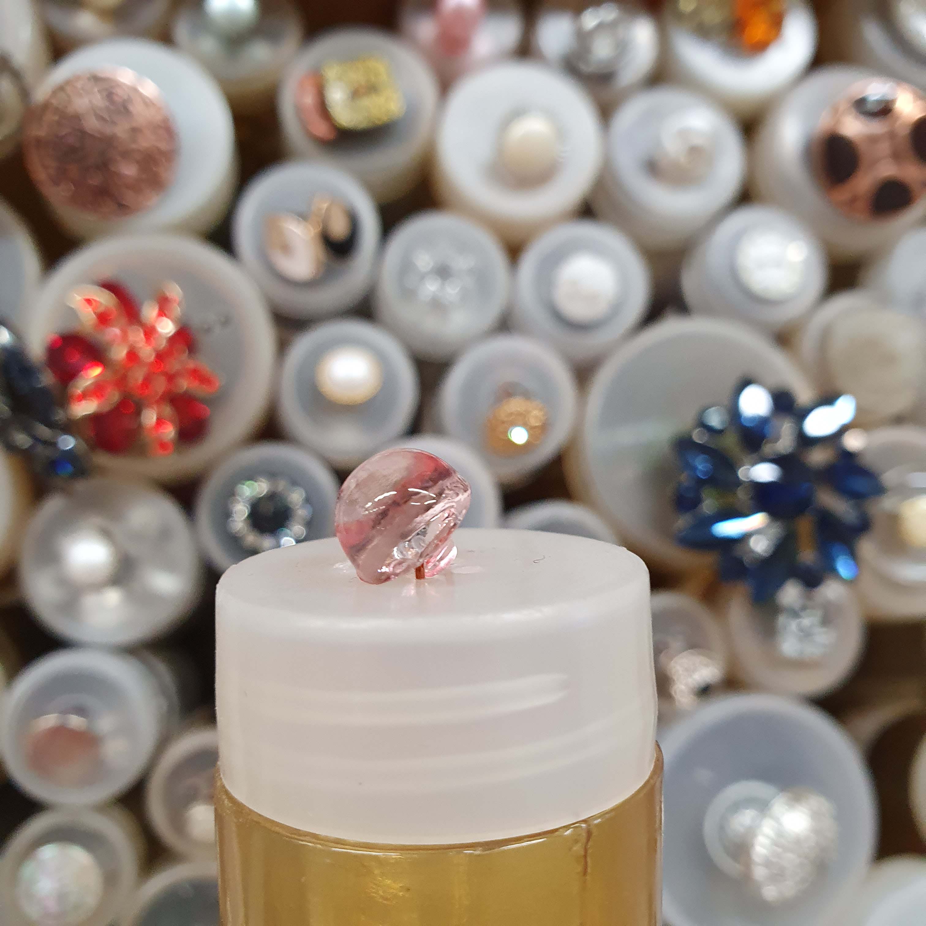 Ružovo priesvitný gombík vypuklý blúzkový cca 0,9cmSkladom0,15 EUR/ ks0,12 EUR bez DPH