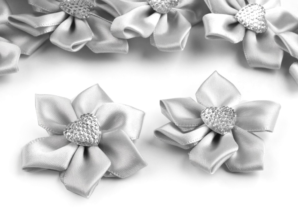 Sivý saténový kvet so srdcom Ø5 cm s kamienkomSkladom0,55 EUR/ ks0,45 EUR bez DPH