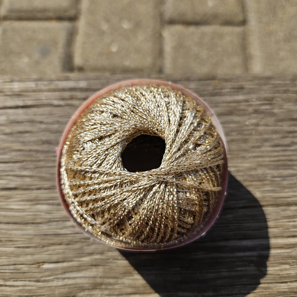 metalizovaná háčkovacia efektná priadza vhodná na ozdobenie vianočných dekorácií, obrusov, podšálok a iných dekoratívnych háčkovaných predmetov