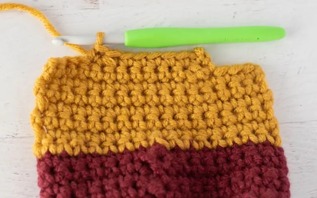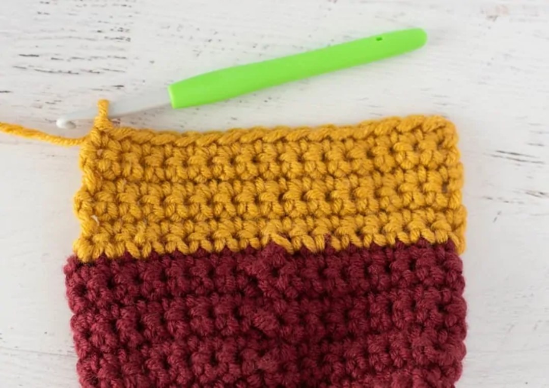 Hotovú prácu preložíme na polovičku tak, aby bol spoj presne v strede a pred nami bude tým pádom 16 očiek, cez ktoré budeme háčkovať. Uistíme sa, že nám bude sedieť striedavý vzor vytvorený rubovou a lícnou stranou krátkych stĺpikov: 29. riadok mal vyjsť s rubovou stranou smerom von a teda nový riadok na päte začneme háčkovať s krátkymi stĺpikmi smerujúcimi lícnou stranou von.