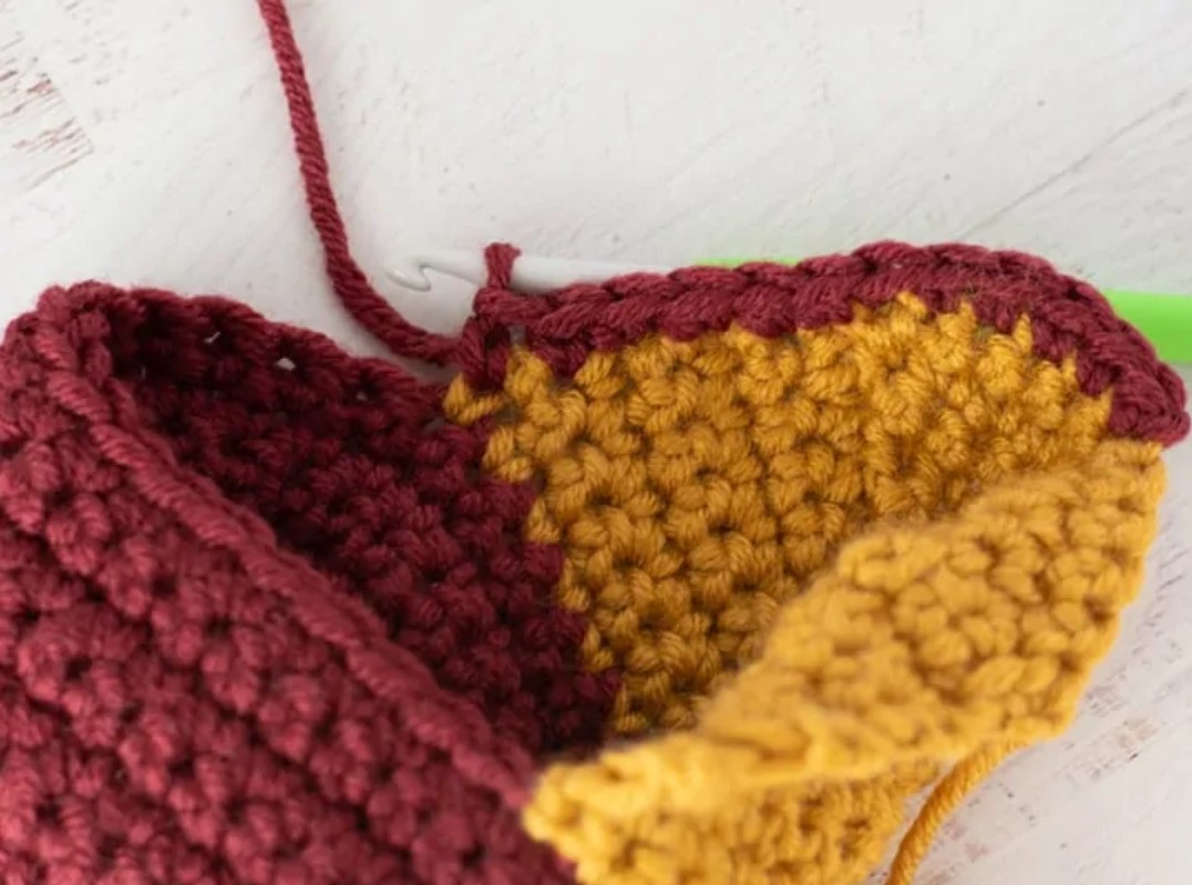 Na znázornenie pätovej časti sú na ukážke použité rôzne odtiene priadze, aby sa dala lepšie odlíšiť od vrchnej časti, ktorú sme už uháčkovali. Avšak aj pätovú časť háčkujeme rovnakou červenou farbou, akú sme používali doteraz.