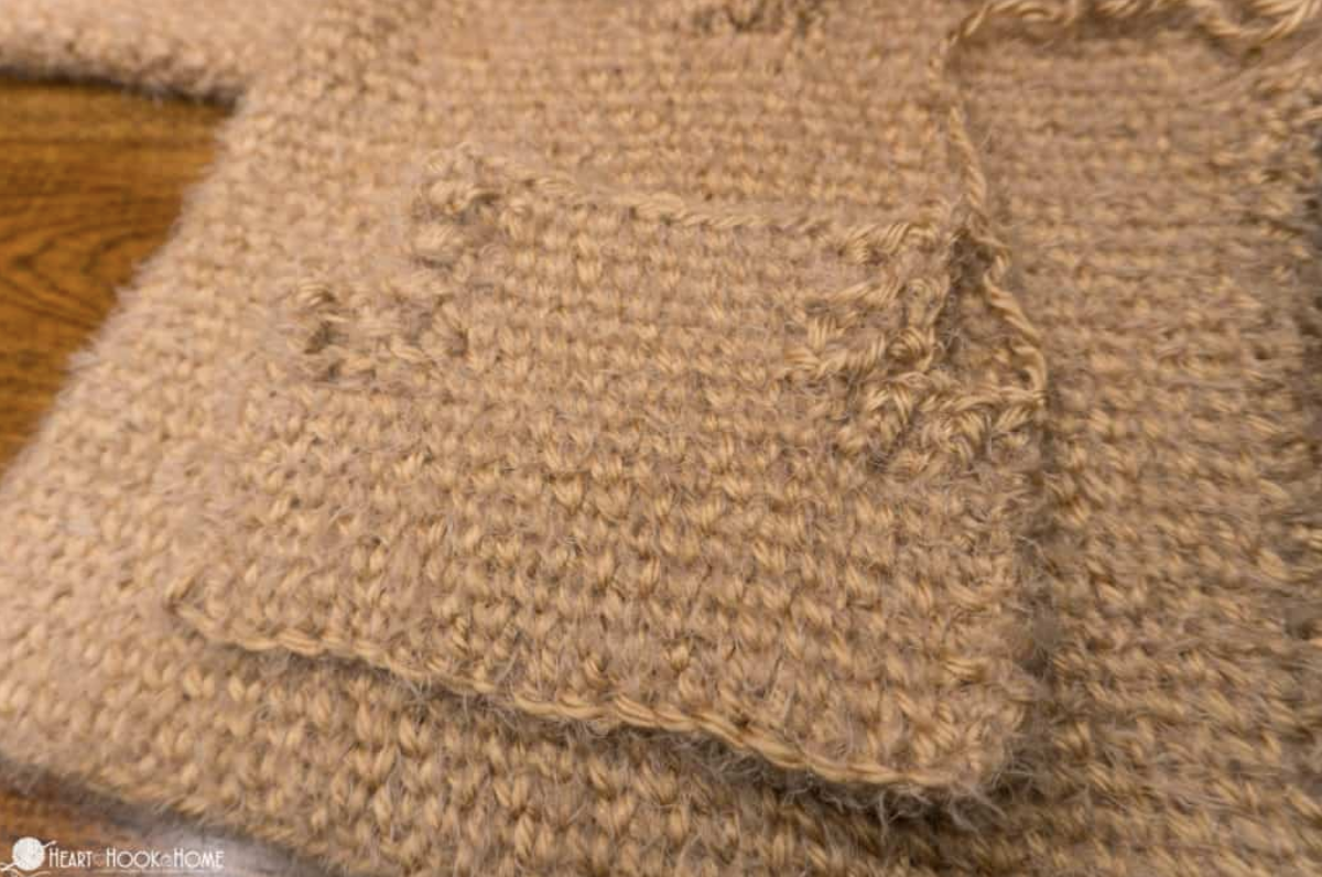 Položte predný diel ku zadnému a zarovnajte strany. Začnite na spodku a zošite riadok po riadku až po vrch, kde ste používali PO – rad 26 – kde pôjdete po vrchných stĺpikoch, namiesto bočných. Uistite sa, že ostávajúce rady sú rovnaké na prednom aj zadnom dieli. Tieto dve strany, tak isto ako ploché časti dielu, budú neskôr slúžiť na vytvorenie otvorov pre ruky.
