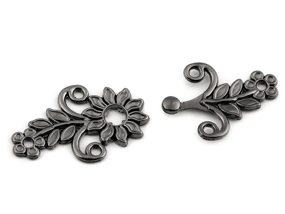Ozdobné zapínanie s kvetinovým motívom sa skladá z dvoch protikusov, ktoré do seba skvele zapadajú. Využijete ho na svetríky, saká, kabelky, blúzky či kabátiky. Zaujímavé je jeho použitie aj na zmenšovanie obvodu nohavíc či sukní.